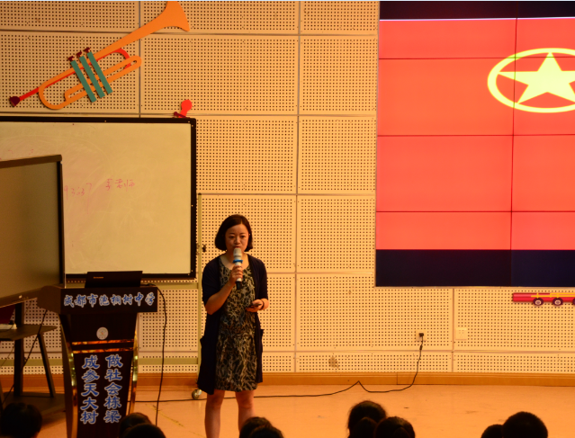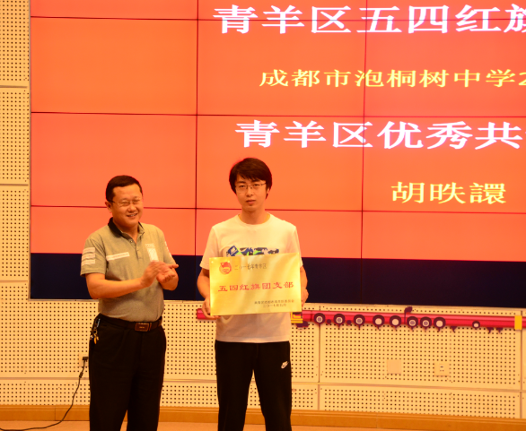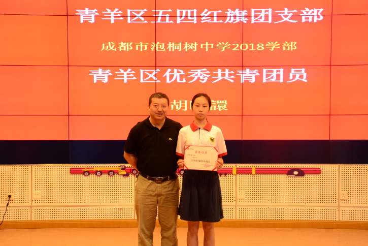 接下来进行的是入团仪式,李鹏老师宣布新团员名单,冉皓均同学带领新团员宣誓,王文杰主任、谢晓霞老师为新团员颁发团徽,李霞霏主任给全体学生作青春寄语,最后颁发的是青羊区优秀共青团员和青羊区五四红旗团支部奖项。