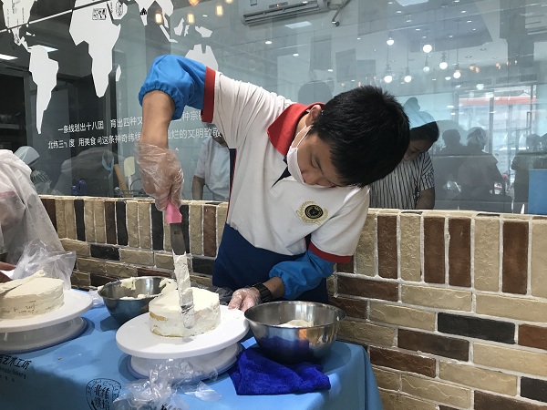 裱花组的同学兴趣高昂,认真观看了裱花师的演示。裱花手法看上去简单,但轮到自己操作时,不少同学表示,很难把奶油抹匀。同学们通过互相帮助或者向裱花老师求助的方式解决问题,在操作过程中学习了很多制作蛋糕的手法和经验。