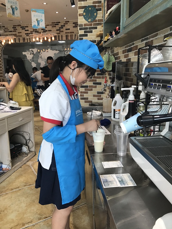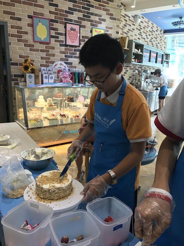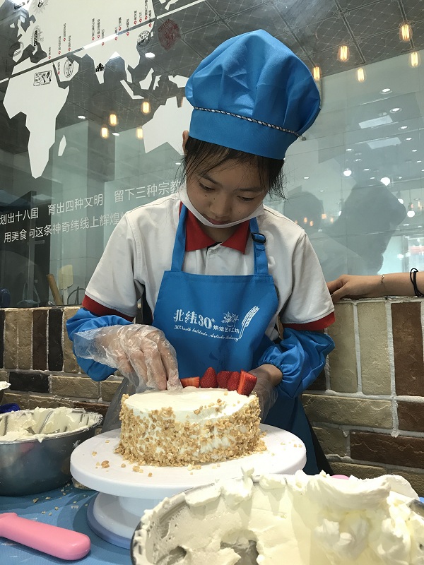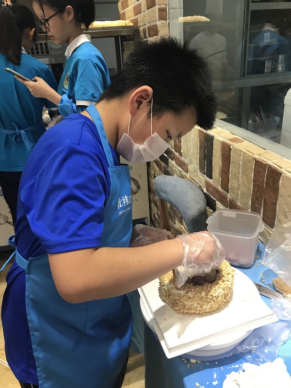 谷子晔:这次的职业考察我选择了北纬30°,这是一家十分不错的烘焙小店。我在这里学会了如何进行包装面包,做饮料和做蛋糕。我们做蛋糕先要把奶油均匀抹在蛋糕胚上,这一步很难。然后把花生粒放在上面,最后把水果放在上面以做装饰。整个过程要持续大概20到30分钟。做面包包装也需要仔细包。我从中体会到无论是做什么都要保持细心以及耐心。要做好一个蛋糕也是不容易的,所以我们事事要细心,还要对工作有热忱的态度。