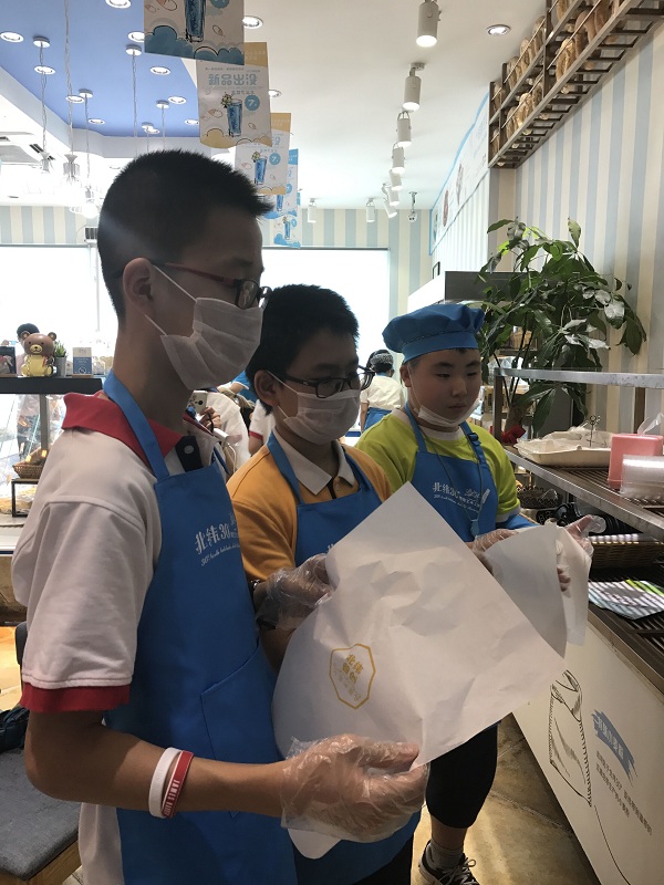 包装组的同学亲历了将新鲜出炉的蛋糕包裹入盒并贴上标签的过程。操作中同学们发现自己包的和老师包装的效果差别很大,仔细询问老师包装的手法并反复尝试,最后,看到自己包好的蛋糕摆上货架售卖出去,同学们都感到很开心。