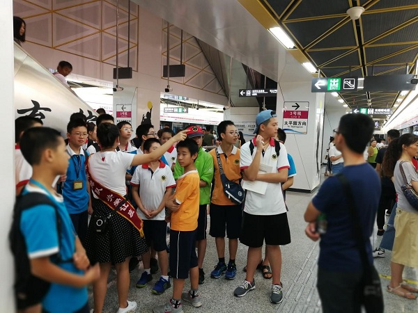 同学们在认真听站台姐姐讲解