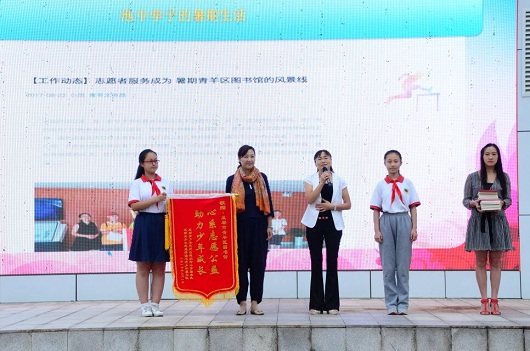 继高校长恳切热盼的致辞之后,来自2018学部的胡昳譞同学代表2018及2019学部全体学生向各位新生表达了作为学姐学长的热烈欢迎。在阵阵掌声之中,泡桐树中学志愿服务队走上主席台,以视频形式带来了他们的暑期生活展示。服务队自成立以来,在极短的时间里吸引了四百同学加入,他们参与意大利博洛尼亚插画展讲解服务、青少年法制教育志愿服务、会务志愿服务、英文阅读志愿服务、图书馆志愿服务等。其中,泡中学子的志愿服务工作得到了青羊区图书馆得大力支持,青羊区图书馆馆长康良琼更是在百忙之中来到泡桐树中学,为全体师生致辞。而为了表达感谢,泡桐树中学两支志愿服务队伍特别赶制了一面锦旗,并由欧燕校长带领两支志愿服务队伍队长将锦旗,郑重交与康馆长。康馆长的讲话,以及各位泡中志愿者的奉献精神和开拓精神,宛如一颗石子投入水中,激起阵阵涟漪,鼓舞着泡中莘莘学子以优秀的前辈、同辈甚至后背作为榜样,努力开拓,奋勇前进。