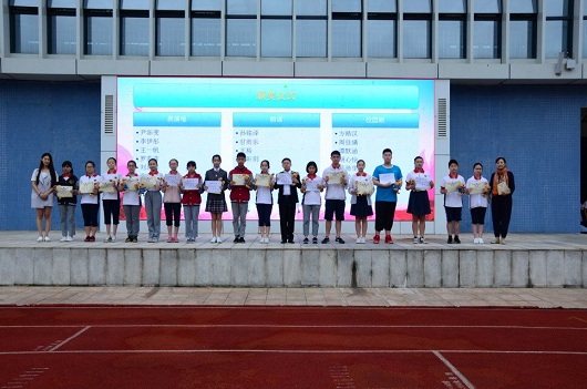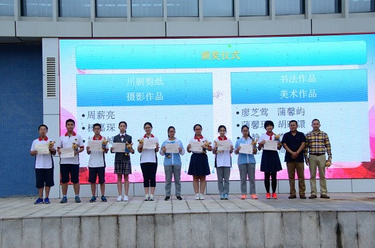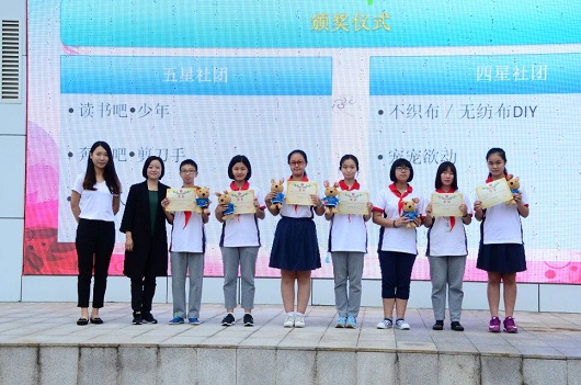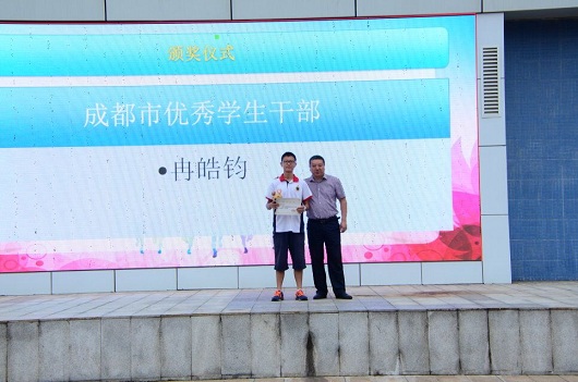 2018学部的冉皓钧同学更是荣获了“成都市优秀学生干部”荣誉称号,并由高仁辉校长颁发了荣誉证书。除了教导学生品学兼优,泡桐树中学作为小小幼苗的一方杏坛沃土,也为学生提供了不同的成长方式和良好的成长空间。五彩缤纷的社团活动极大地顺应了不同学生的兴趣发展,在上一学年表现格外优秀的社团获得了“五星社团”和“四星社团”的荣誉称号,并由成长联合会主任李霞霏老师和社团负责老师赵时莉老师为他们颁奖。与社团活动类似的,泡中特有的艺术课程也帮助泡中学子在自己的爱好天赋上更进一步,在剪纸、书法、摄影、美术、戏剧、国学、朗诵等等不同领域都获得了斐然佳绩,于青羊区种种比赛展演中斩获了六个一等奖、三个二等奖和两个三等奖。杨超校长、欧燕校长、赵东书记、李勇老师、陈薇老师、陈辰老师分别为这些同学颁发了奖状。而设计了泡桐树中学第一毕业证书的刘芮伊同学,则由曾任教已经毕业的2017学部的张帆老师颁发设计者证书并赠送吉祥物——“栋栋”。“栋栋”是泡桐树中学首个吉祥物,外表可爱的它,寓意志远、求真、务实、善博爱、热爱公益等美好品质,将常驻泡中学子心中。
