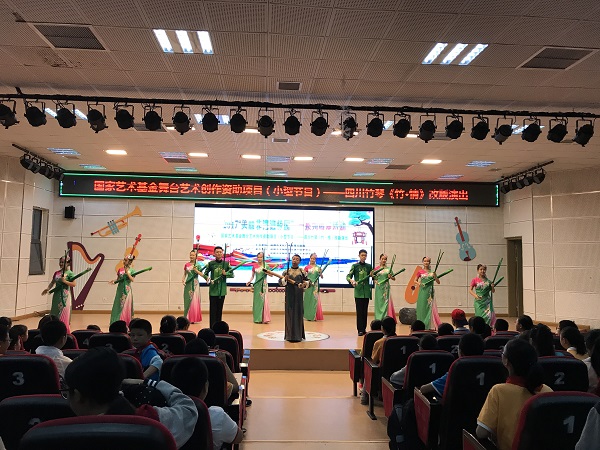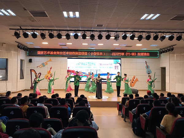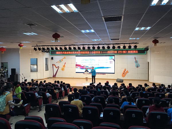 “竹琴声声入人心”,在主持人的引导下,同学们渐渐融入了第一个特色节目当中。当演员们手敲翠绿竹琴,高谈四川方言时,台下的同学们露出了新鲜又好奇的目光,但对于那一口口地道的“四川话”时,又引起了阵阵共鸣。一张张稚气又兴奋的脸颊,一句句激荡又新奇的赞叹,一声声洪亮清脆的掌声,抒发着同学们对于非遗文化的喜爱。文化虽是经过了几千年的风霜,但因为它独有的古韵,一代代年轻人的热情和努力,铸造了台上的每一句话,每一个字,每一个词。此时此刻,台上台下人的心,紧密地联结在了一起。