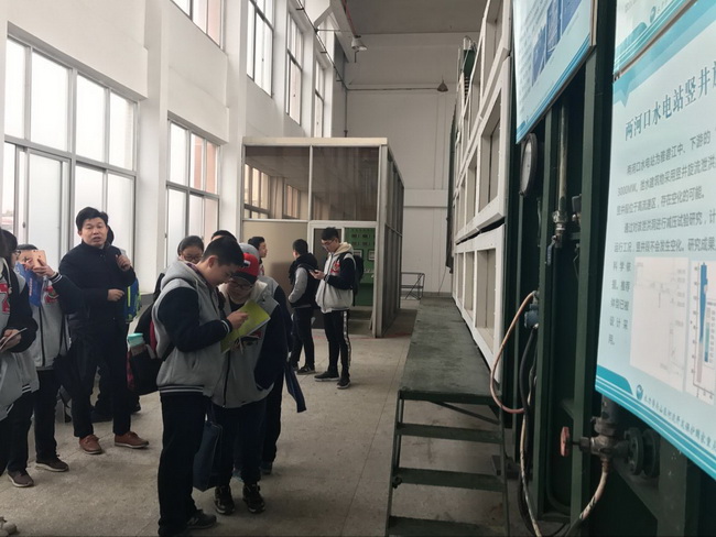 学院老师热情的接待了我们。老师首先在大厅给我们介绍一张巨大的中国地图,上面详细地刻画了我国的每一条江、每一条河,并且在这这张地图上,我们分别看到了每一个水利工程的详细位置与修建时间,接着老师把我们带到了一块模拟场地,这块模拟场地上有各种水库、水电站、水动装置的模型他们向我们介绍了实验室的发展情况,带领参观了室外的河流动力学模型。我们还了解了水工结构实验室,该实验室的变温相似材料地质模型为业界首创。我们还参观了水动力学实验室,该实验室陈列有水轮机模型,循环水洞试验段流速和压力可以分别控制,水流在管路中循环、用以研究高速水流的密封实验装置。这些设备引起了同学们的好奇心。专家们还讲解了岩土工程方面的实验设备。