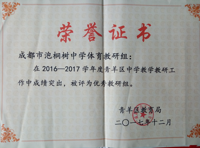 成都市泡桐树中学体育教研组,被评为2016-2017学年度青羊区中学优秀教研组;学校优秀团队一等奖;张勇老师获校优秀教研组组长称号。