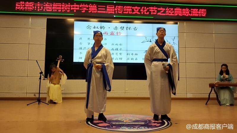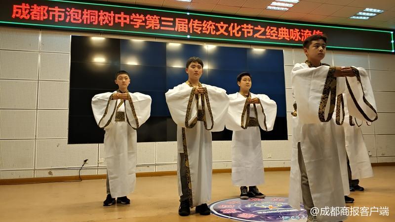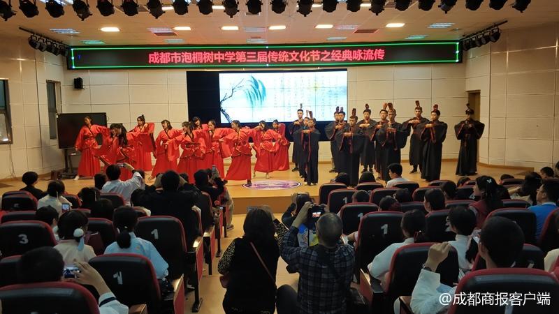 “蒹葭苍苍,白露为霜。所谓伊人,在水一方。”台上咏唱的是一群身着白衫的翩翩少年,台下鼓掌喝彩的是身着汉服的儒雅师生。人们仿佛穿越秦汉,置身在千年前的文化学堂,相施以礼,谈诗作赋。其实,这只是一场来自于成都市泡桐树中学的传统文化节汇演活动。