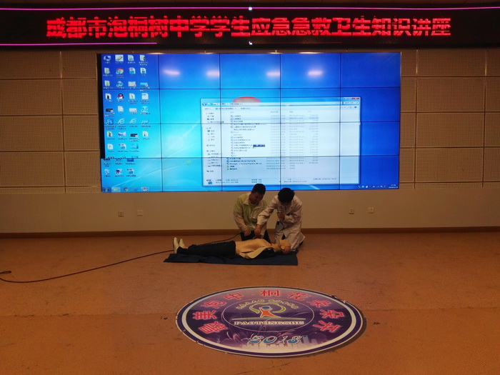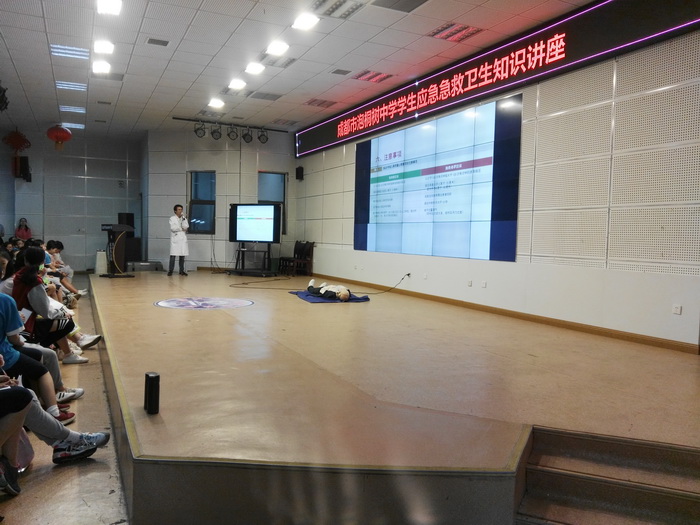 下午5:10,在学校多功能厅,金沙社区卫生服务中心的医生首先介绍心肺复苏的原理和重要性,以通俗易懂的语言表达了学好急救知识的重要性,在场师生认真聆听,仔细体会。然后医生播放了华西医院“心脏复苏”的视频,加深了学生们对“心脏复苏”的理解。