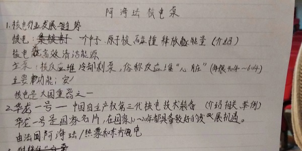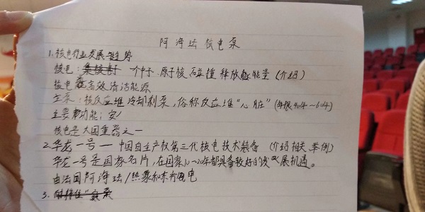 吕叔叔讲得十分详细,让我们了解了核工业发展的迅速以及我国军事力量的强大,让我受益匪浅。 一个个清晰汉字谱写出中国的强大力量 一张张宏伟的图片勾勒出了未来核电发展的趋势图。同学们都兴致勃勃地听专家演讲,到了提问时间,就开始争先恐后的提问,希望获得更多的知识。四处洋溢着青春与活力。我们仿佛已经置身于阿海珐公司的工作中,身处于为国家效力,为国家奋斗的时候。