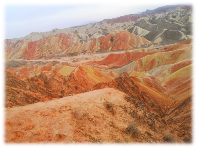 丹霞地貌:由于亚欧板块和印度洋板块挤压,形成了褶皱,不同的岩层堆积起来,遇到氧气发生氧化,形成了不同的颜色