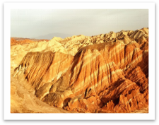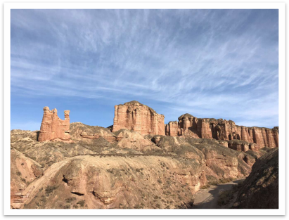 这里没有风雪,没有冷风,有的是蓝天,阳光,和赤红的山丘。放眼望去,天下一片赤红,各种山丘摆出各种造型,巍峨之中不失风趣。它们巧夺天工,有柱状,城堡状,针状,塔状等数不尽的形状。只是种种形状,也都离不开红。这儿之所以如此红,是有原因的。远古时期,喜马拉雅山运动时随着地壳的抬升,山体坍塌,而保留下来的红色砂岩经过长时间的风化剥离和流水侵蚀,就成了如今的奇形怪状。总之,可以一句话形容冰沟丹霞,“色如渥丹,灿如明霞。”