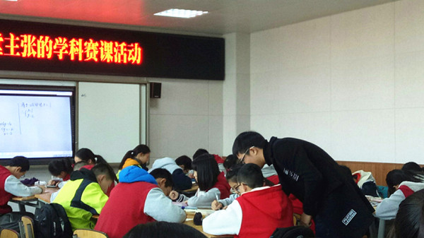 钱良均老师的《平行线》以组内协作组间竞争的模式激励学生参与讨论,课堂的知识生成由学生完成,学生脸上展露的笑容真实地传达出了钱老师“幸福课堂”的理念。郑何老师的《解一元二次方程组》采用贴近生活的情境引入,创设了良好的课堂氛围,例题层次分明,由浅入深,学生展示充分,互动交流生动活泼,是一堂有数学味的数学课堂。税启隆老师的《二元一次方程组与一次函数》设计逻辑清晰、层次分明,课堂生成自然,注重操作、感知、理解、辨析,关注每一位学生的过关过手。席仕峰老师的《二次函数复习》紧扣要点、行云流水而自然生产,师生交流互动充分、氛围融洽,实现了以学促教、以教助学。向荏杰老师的《圆》激趣引入,娓娓道来、讲解细致。