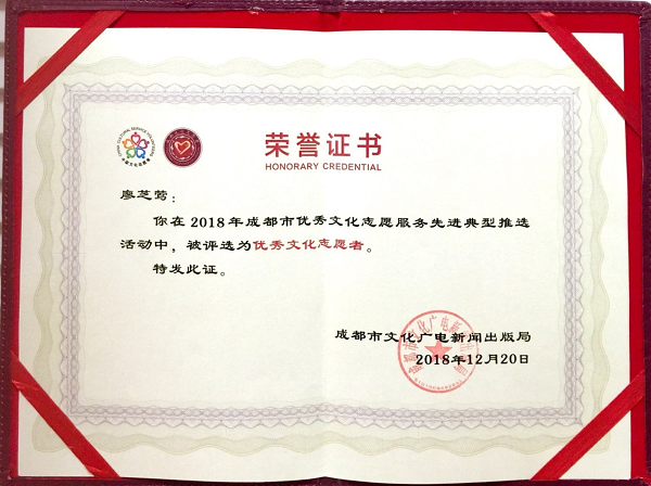 2018年12月28日,由成都市文化广电新闻出版局主办的“2018年成都市文化志愿服务工作先进典型表彰大会”在成都市文化馆举行,会上表彰了优秀文化志愿者10人、优秀文化志愿服务项目5个、优秀文化志愿服务组织5个。我校2019学部廖芝莺同学当选“优秀文化志愿者”。