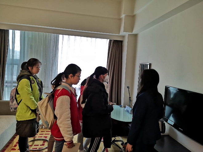 在这次体验活动中,同学们还亲自动手进行了会议室的布置,桌椅摆放、纸笔、旷泉水的位置都是有讲究的。在乘座电梯的过程中,我们发现酒店的安保工作也非常有特色,你只有持有客房卡才能到达相应的楼层;客房的房门也是自动关闭。