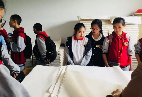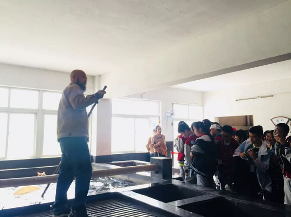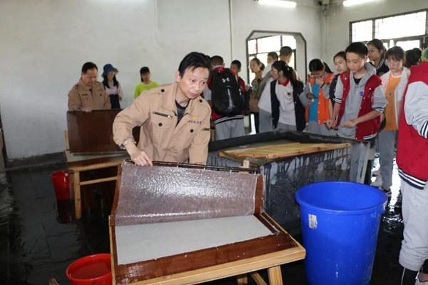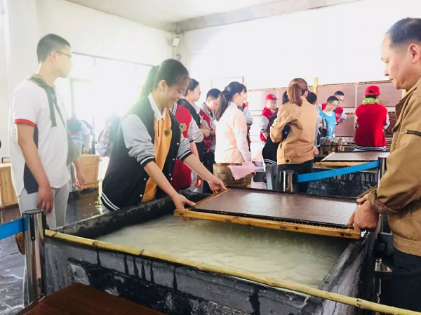 宣纸的制作工艺非常繁琐,需要勇当地的青檀皮等原料碾碎、浸泡、发酵、打浆等流程。同学们亲手体验水中捞纸这一环节。