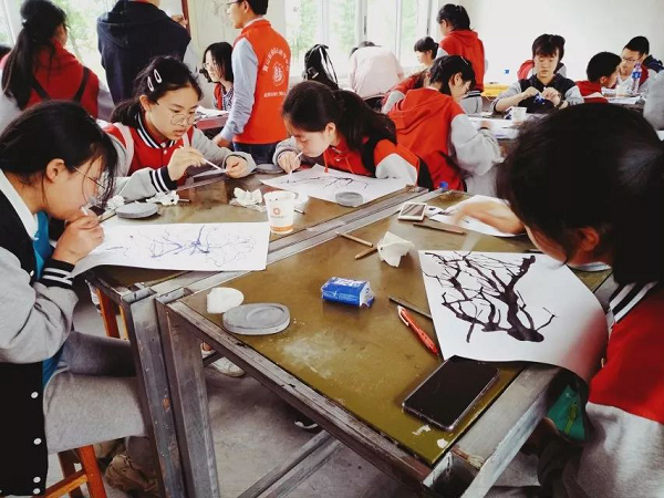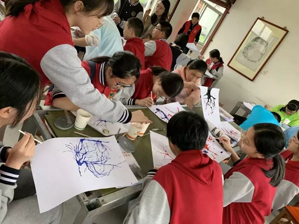 同学们用徽州宣纸体验“吹墨画”,并完成一幅作品。