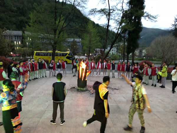 与藏族同胞一起“跳锅庄”。 锅庄舞,又称为“果卓”、“歌庄”、“卓”等,藏语意为圆圈歌舞,是藏族三大民间舞蹈之一。羞涩的孩子们刚开始还有些放不开,被热情的藏族朋友感染,也都开始尽情的歌舞了。