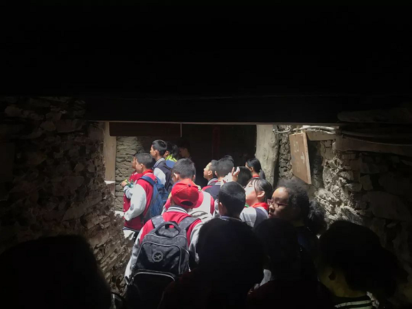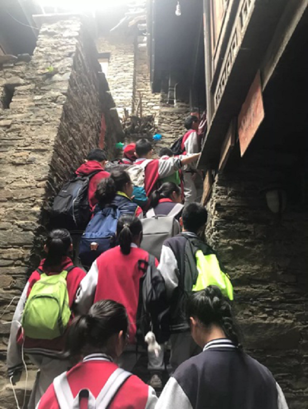 碉楼是整个寨子的标志性建筑,目前仅存两座。碉杰分为9层,高30米左右,各层四方开有射击窗口,顶楼的钟孔是作为传递信息用的。同学们一面小心冀冀的爬着碉楼,一面感受着这充满神秘色彩的古堡。