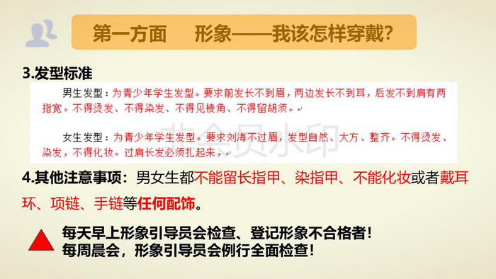 出勤形象组的赵时莉老师再次强调学生的发式、服饰、上学时间等要求。