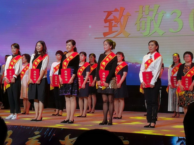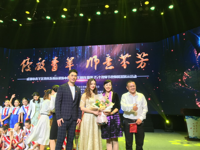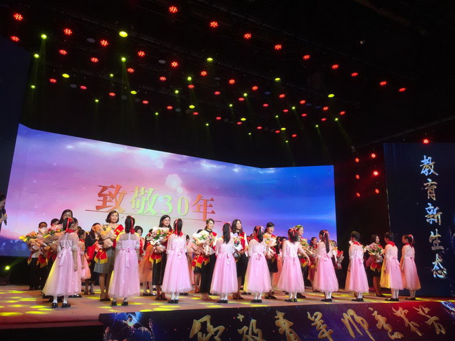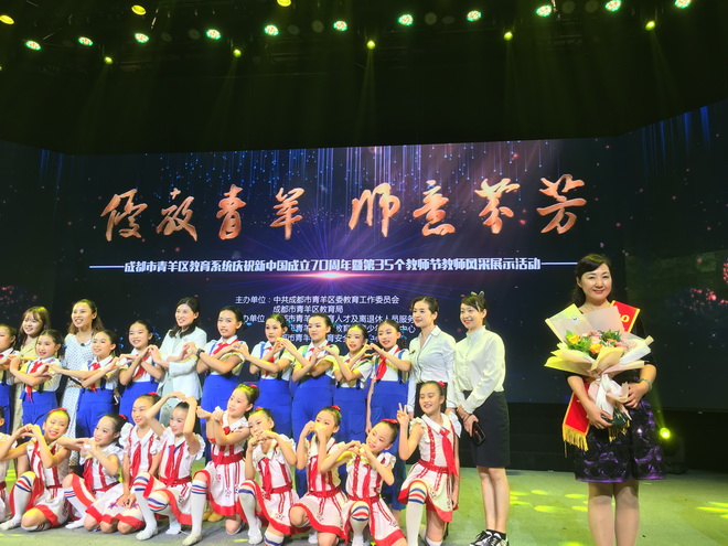 可爱的孩子们为三十位教龄满三十年的青羊教师献上鲜花,泡桐树中学欧燕副校长作为三十年教龄教师代表上台接受荣誉和祝福。