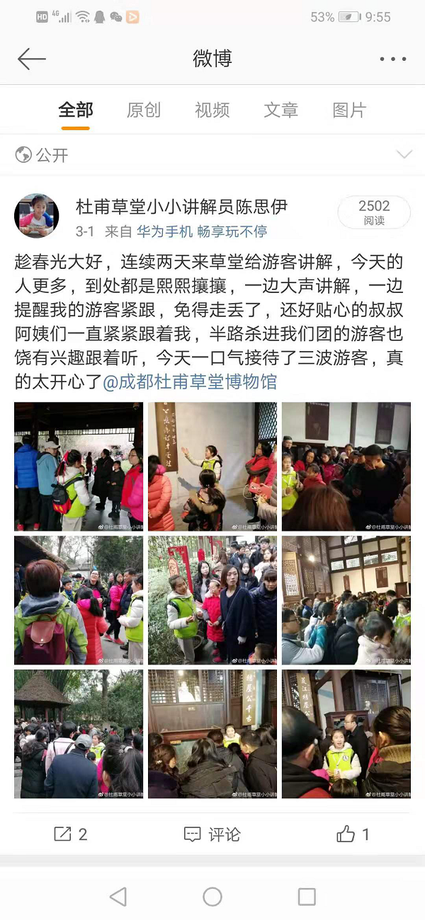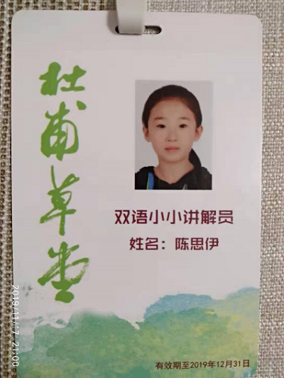 虽然现在上了初中,学业很忙,但是我坚持把讲解员这个工作做下去,每个月我仍然要抽出2天的时间去草堂为来自世界各地的游客服务,传播诗圣的诗词和故事,也是在传播我们伟大祖国深厚的文化。我是杜甫草堂的小小的讲解员,我们是传播中华文化的小小使者,这让我深以为傲!