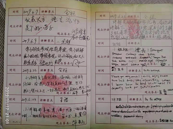 到目前为止,已经服务过88个小时,超2600人次的讲解,我服务过国内各个省份的游客,也接待过来自法国的70多岁的奶奶,来成都留学的英国留学生,还有泰国的美丽小姐姐,当然也有我们邻国的韩国留学生和“巴铁”大叔,看到他们用心的签字,主动同我合影留念,这是对我工作成果最大的肯定。