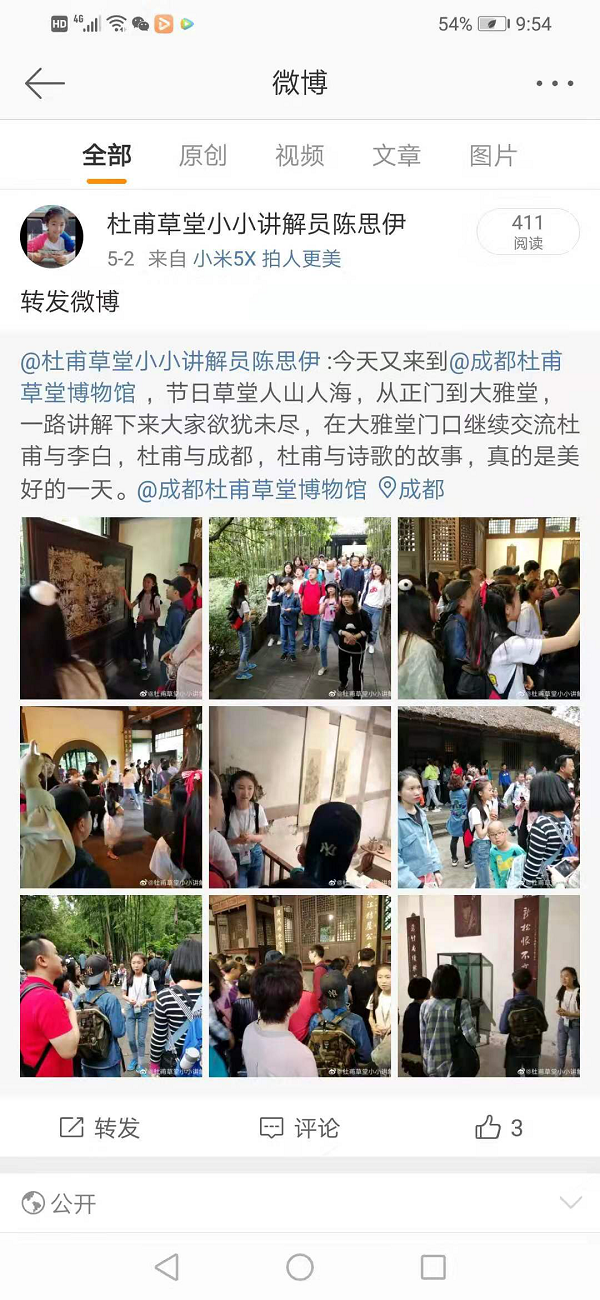 2018年夏天,在知悉杜甫草堂招募小小讲解员的消息后,经过层层选拔、考试、面试,我终于成为了杜甫草堂的小小讲解员。每个月两次,每次至少2个小时为游客进行专业的讲解服务;同时还要做微博上对当月的活动进行总结和传播。经过半年的讲解锻炼,我不断丰富跟杜甫和草堂有关的诗词,与杜甫和成都有关的文人墨客的历史故事,丰富讲解内容的同时,也让自己的知识越来越丰满圆润。
