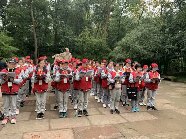 我们不仅了解了关于郭沫若的生平与他的家庭。了解他的爱国情怀。我们还在他的纪念馆前朗诵了他的两首诗《静夜》和我们极为熟知的-《天上的街市》,我们虽然不是很懂他的诗背后的意思,但是我们依旧十分认真地读着,我们小组的同学们实际上都比较贪玩,似乎看起来一点儿都不在意这件事情,但是在最后我们小组上去朗诵的时候,我却能感受到他们非常用心的在朗诵,让我深受感动。