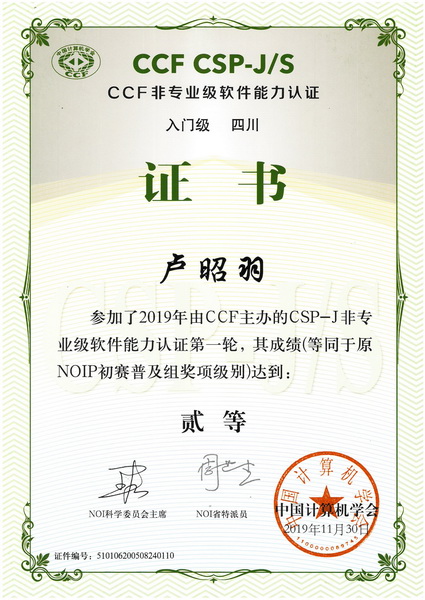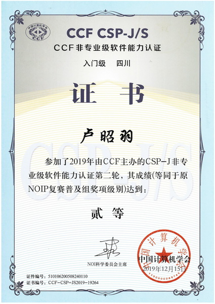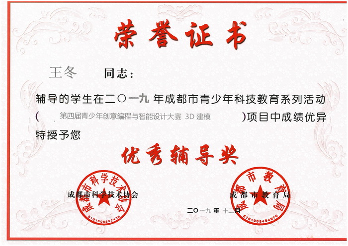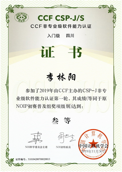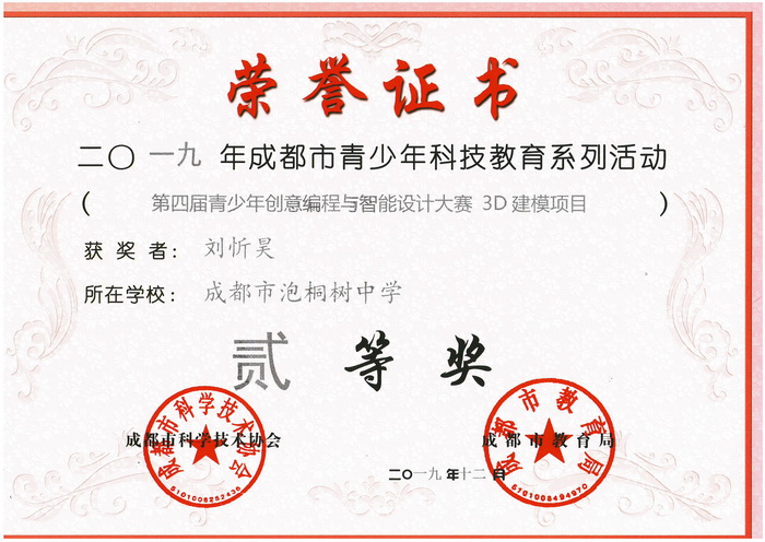 我校创新技术中心教师在学校的大力支持下、在计算思维名师工作室的引领下,引领学生积极参加由中国计算机学会组织的CSP认证比赛和成都市3D建模比赛,我校学生荣获佳绩。获奖同学如下: