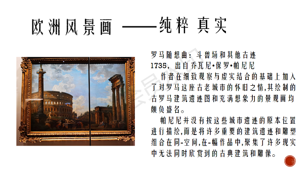 那么,我将挑选两幅最具有代表性的画作,和大家共同追那段文化艺术的洗礼。首先,如果要用两个词来概括欧洲的风景画的话,我认为纯粹与真实就再合适不过了。图示这幅画,它的本雪名叫《罗马随想曲》主要描绘的是古罗马斗兽场和其它的一些古迹,它作于1735年,出自帕尼尼之手,单从选材来看,我们就可以发现作者对罗马这座城市的情有独钟与怀悔旧之情。这幅画最一妙的地方在于它并没有完全地将罗马和古罗马周边的景致还原,而是将众多名胜古迹搬到了同一空间中,让我们欣赏到了在现实生活中无法同时欣赏到的景观。