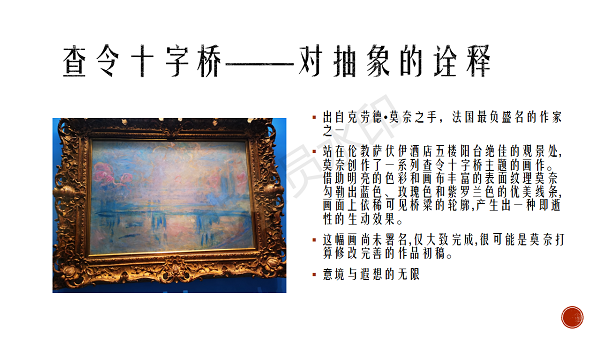 下一幅画名为查冷十字桥》,出自莫奈之手,他是法国最负盛名的作家之一,相信大家也有所耳闻;这幅画我看到的第一感觉是无限的意境与遐想以及常给了我一场视觉的盛宴。莫奈站在伦敦萨伏伊酒店五楼阳台的绝佳观景处创作了一系列《查令十字桥》的画作。他勾勒出蓝色,紫罗兰色玫瑰色的优美线条,在画中,远处的桥若隐若现,正给人那种无限的意境和遐想它更是一种对抽象画的诠释。此外,这幅画还有一个未解之谜-这幅画并未署名,据历史学家的推测,它很有可能是莫奈还未修改的作品初稿。