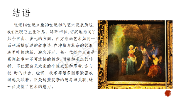 最后这幅图片,它名叫《乡村舞蹈》,我们不难从中看出人们欢快的生活。其实如今的我们,去追溯这段历史,我们会发现它生生不息,环环相扣,每一位创作者都是其中不可或缺的一部分,他们与这段传奇的历史,在冲撞与革命的浪潮中吐故纳新,跌宕浮沉,不储他们的主张与思想(画风)的转变有关,更与彼时的社会环境,经济条件有关,而正是这些复杂的思考与关联,造就了艺术的魅力,进一步成就了今天的辉煌的艺术殿堂。我也希望大家在以后的生活中用心地去感受隐藏于我们身边的艺术,谢谢。