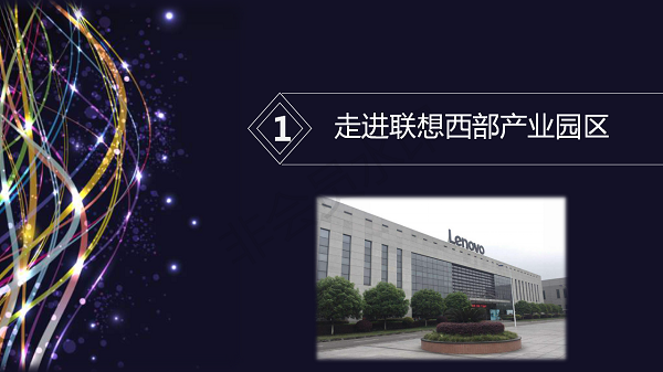 联想西部产品园是生产、研发和销售为一体的产业中心,2011年12月19日第一台联想成都造产品在这里下线。这里可以年产1000万台电脑!电脑销售量稳居世界第一,成为全球最大的PC生产厂商。讲解员姐姐说我们集团的企业定位是:联想从事开发、制造及销售最可靠的、安全易用的技术产品。联想的成功源自于不懈地帮助客户提高生产力,提升生活品质。 联想推崇的品牌精神是:高端品质、创新、国际化和企业责任。