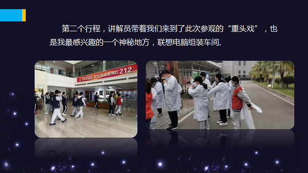 下一个行程,讲解员带着我们来到了此次参观的“重头戏”,也是我最感兴趣的一个神秘地方,电脑组装车间。在这里,我们还遇上了天府七中高中部的大哥哥大姐姐们。到达车间门口后,工作人员给我们每人都发了一件防静电服,必须穿上。我很纳闷,电脑组装和静电有什么关系呢?带着这个疑问,我走进了这个神秘的地方。