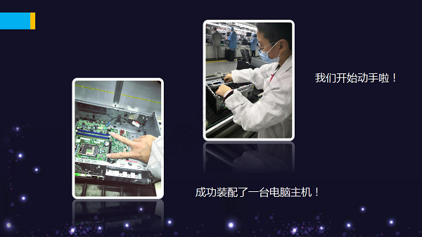 在车间员工培训区,工程师叔叔讲解了电脑的基础知识,组建结构,功能作用等,病用样机为我们进行了演示。我们佩戴好静电装备后,开始自主装机体验,工程师叔叔根据我们的操作情况,在一旁耐心的给予指导。我们在指导下完成了固定主板、安装电源、安装硬盘、光驱、整理线材等装机步骤。在整个过程中,我们开心极了,亲手组装出了人生中第一台电脑机箱。