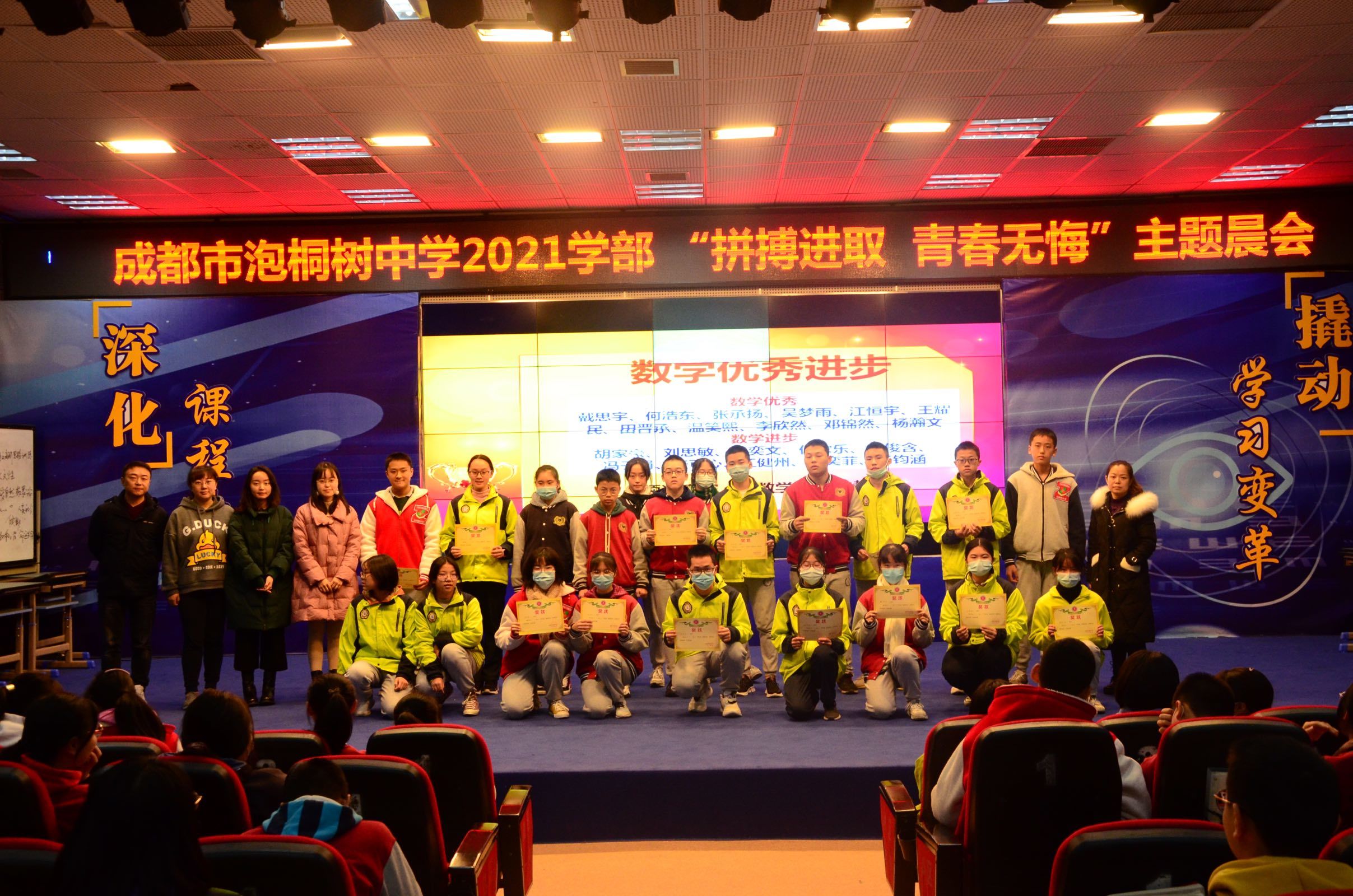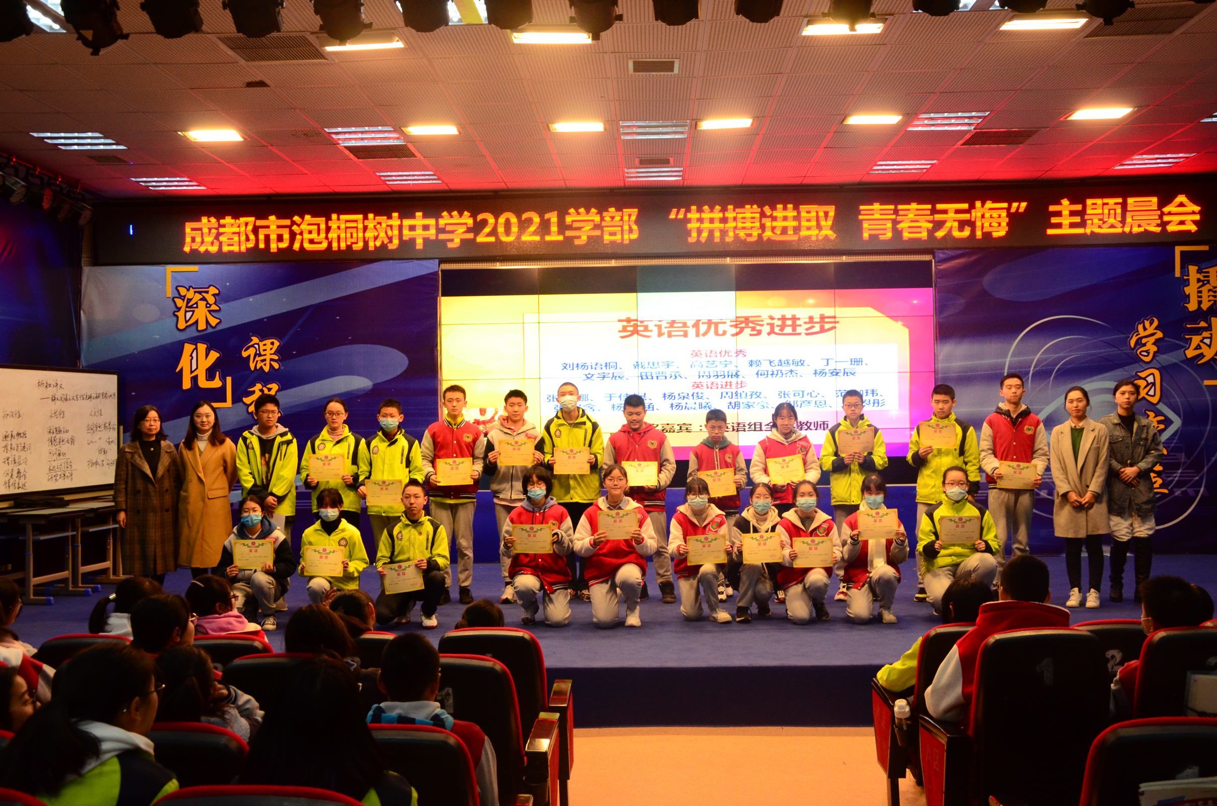 学期过半,一部分同学在半期考试中取得总分前十的好成绩,也有一部分同学稳步上升,校领导和各科学科老师为期中考试中优秀同学和进步同学颁奖。