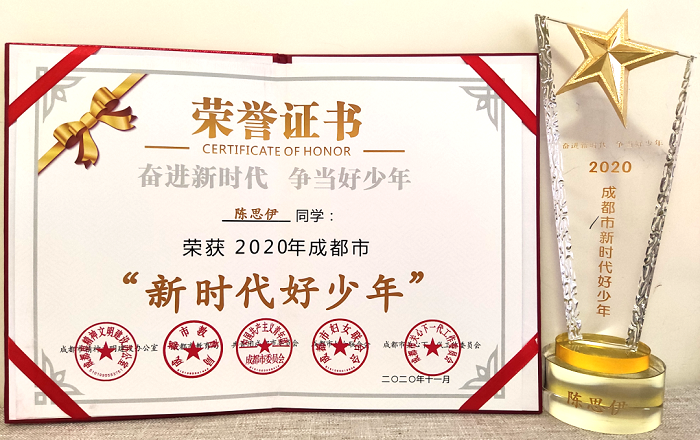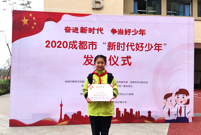 其中,成都市泡桐树中学陈思伊同学荣获2020年成都市“新时代好少年”。