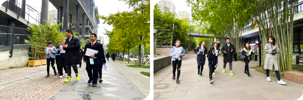 如此大的体量规模和独特的建筑风格,瞬间激发了组员们的浓厚兴趣,大家即刻走入西村深处去亲身感受。体育与美食、休闲,文创是如何在一个空间里完美结合并且相互作用的呢?“体投公司”又是如何将各类资源在这里创造出属于我们成都特色的呢?带着种种疑问,同学们冒着蒙蒙细雨跟随伍老师和企划部的彭老师从环形跑道入口开始参观这座会呼吸的城市院落。