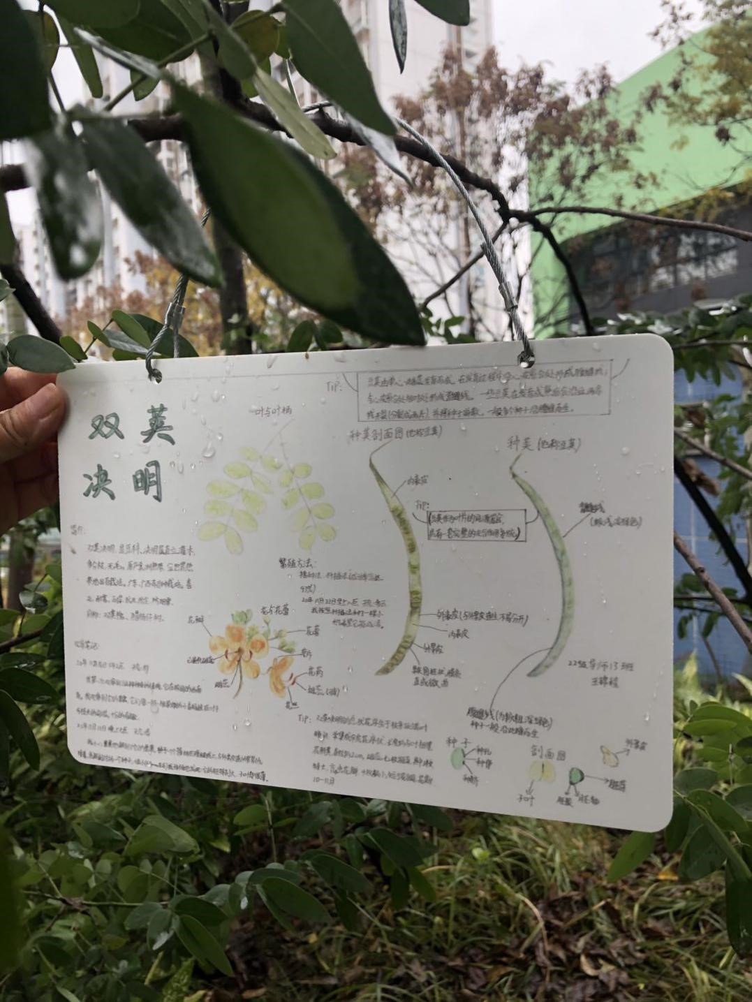 在课程开展中,先由生物组老师们带着孩子重走校园,对校内植物深入认识,然后各自选择植物种类,构思完成自然笔记。最后通过层层选拔,优秀的自然笔记还被作为该植物的挂牌展示,永久存留在校园内,不仅是提升了孩子们的生物学素养,也在校园中留下了