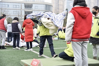 初一,初二同学齐聚操场,各个导师班都准备自己的活动,每一个都可谓别出心裁。整个操场上遍布同学们欢乐的影子,在一班,“致敬挑山工人”的活动上,所有的人——不分高矮胖瘦,年长年幼,学生师长,都肩扛担子,吊着硕大的书包奔跑在跑道上,虽然真正的“挑山工”在崎岖的山路上艰难向上,但是在这里,他们同样被淡青色的扁担压疼了肩膀。在九班,有“追赶时间的骑士”——“外卖小哥”,更有意思的是在十三班,他们的“巧手钉扣”活动,蒲天林老师也一针一线的缝起布扣,四周的同学目不转睛,把他紧紧围住,四面惊呼不断,可蒲天林老师仍然面不改色,一心一意,面带微笑的缝着布扣。