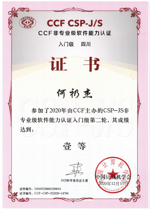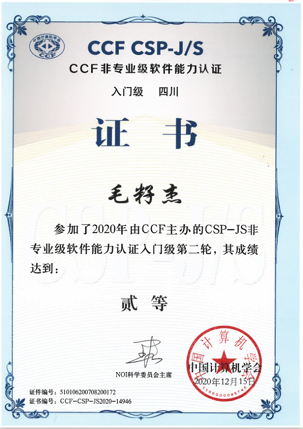经过两轮的层层选拔,我校2018级学生何礽杰同学拔得头筹,达到一等的好成绩。2019级学子毛籽杰同学卓绝群伦,在CSP认证比赛的激烈角逐中,获得第二名的好成绩。