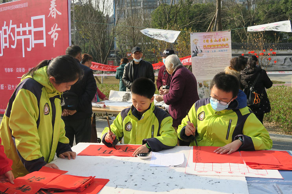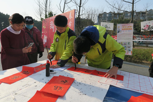2021年2月5日,成都市泡桐树中学云山起翰墨书法社的同学们到黄忠社区参加“我们的节日写春联,迎新春,送祝福”社区文体活动。这次活动是由黄忠社区组织,通过邀请书法爱好者为社区居民书写春联,以迎接新春的到来。