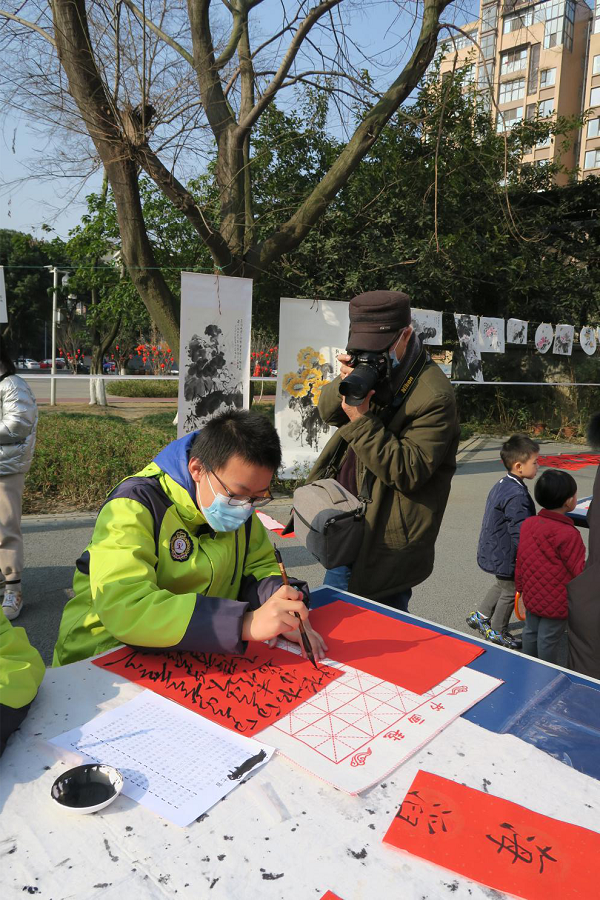 活动中,云山起翰墨书法社的同学们积极地为社区的居民们书写春联、福字,得到了大家的一致称赞。旁边围观的爷爷奶奶和社区工作人员连连夸赞同学们字写得好,一直站在旁边,等同学们的春联一写完就立即“抢走”,书法社成了妥妥的全场人气担当。看到自己写的春联和福字那么受欢迎,看到拿到春联后的爷爷奶奶乐呵呵的样子,看到阿姨笑得弯弯的眼睛,看到小朋友趴在桌旁羡慕的眼神,同学们心中也有说不出的快乐。