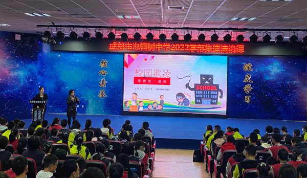 3月26日星期五下午,由曾担任青羊区人民法院家庭法官的古夏飞老师主讲、泡桐树中学李霞霏校长主持的《校园欺凌,青春的一道疤》法治讲座在校多功能厅举行,2022学部全体学生参加。