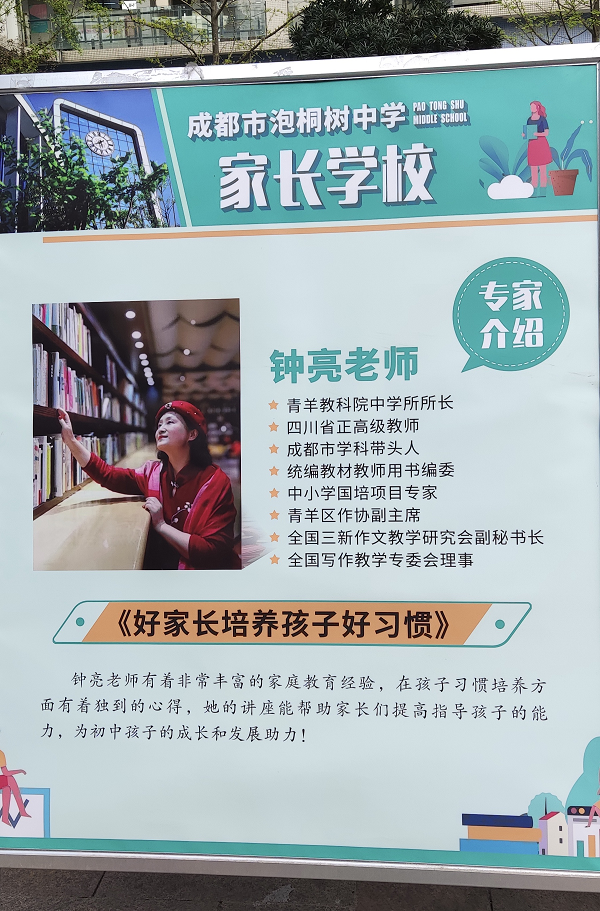 本次家长学校,由青羊教科院中学所所长钟亮老师主讲,为2023级部全体家长提供了一次进校学习和互动的机会。钟老师就家庭教育最重要的是什么、初中阶段要培养哪些好习惯、怎样做好初中家长伴孩子成长得更好等问题,分享了自己的独到心得。