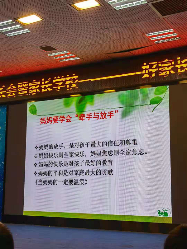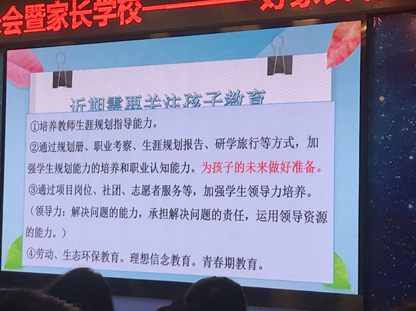 张帆老师在会议上给家长们汇报了学校近来的工作重点,也强调从现在开始,就要重视对孩子的生涯规划教育,帮助孩子梳理奋斗的目标。