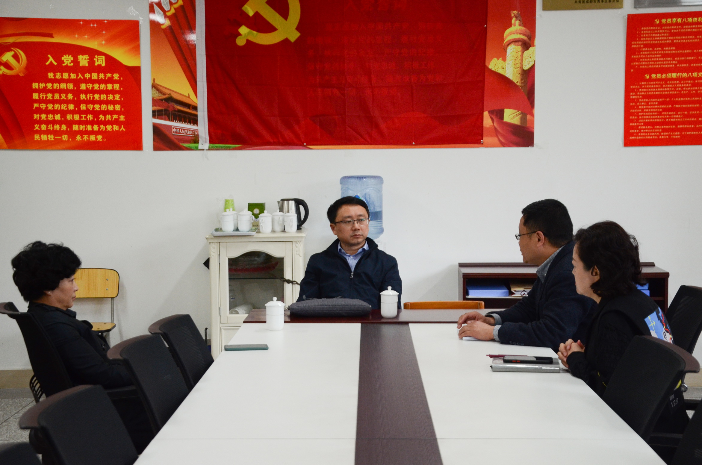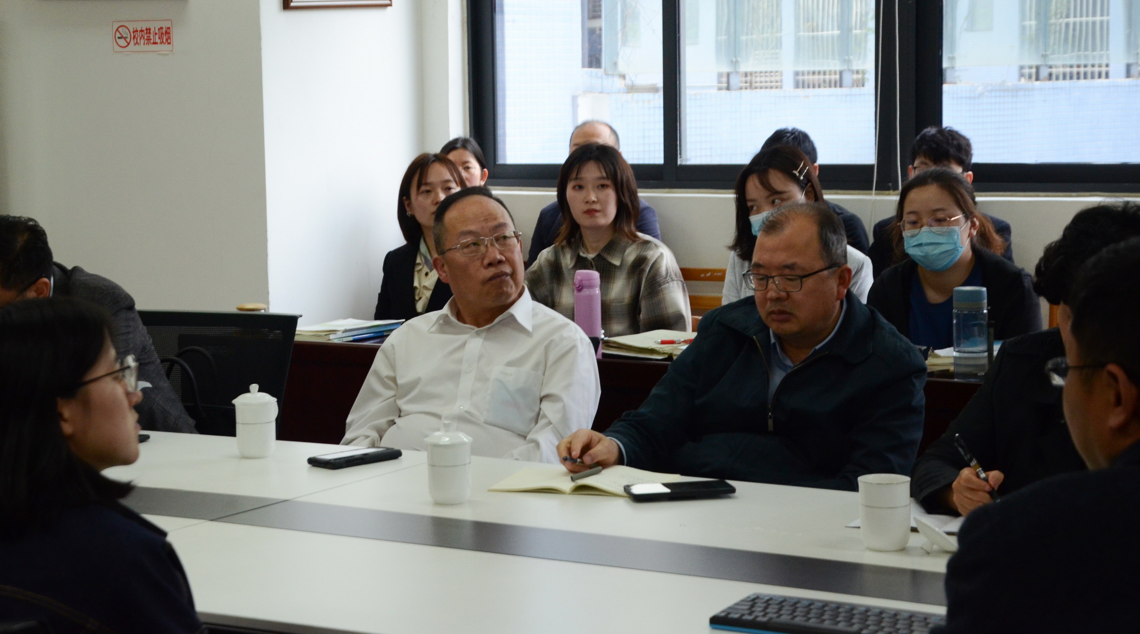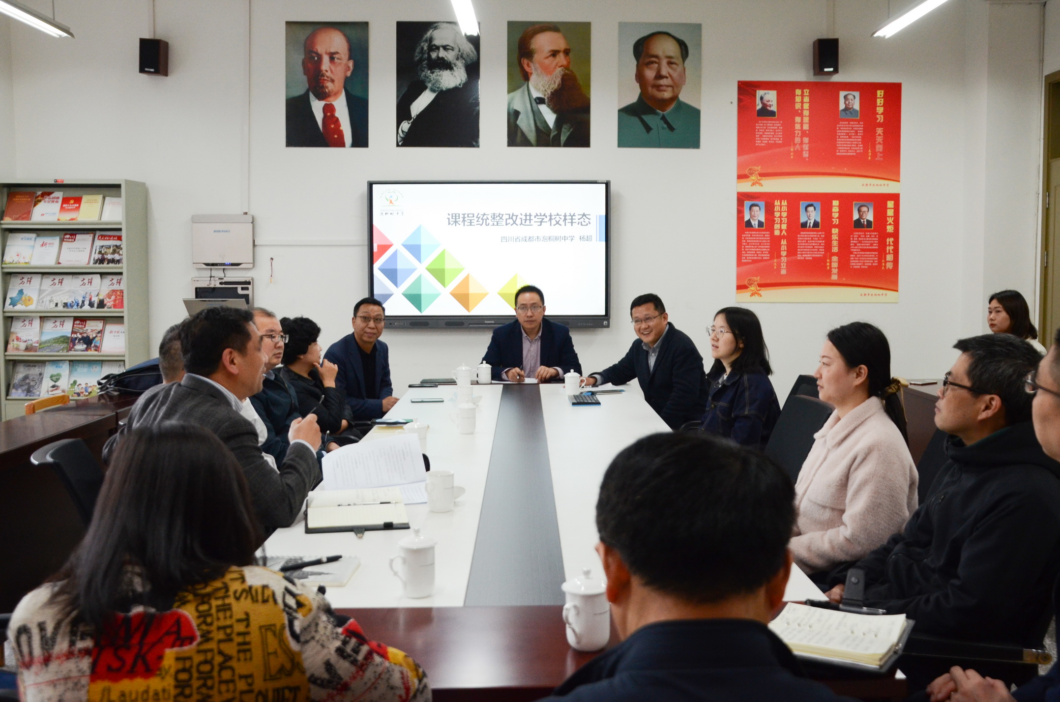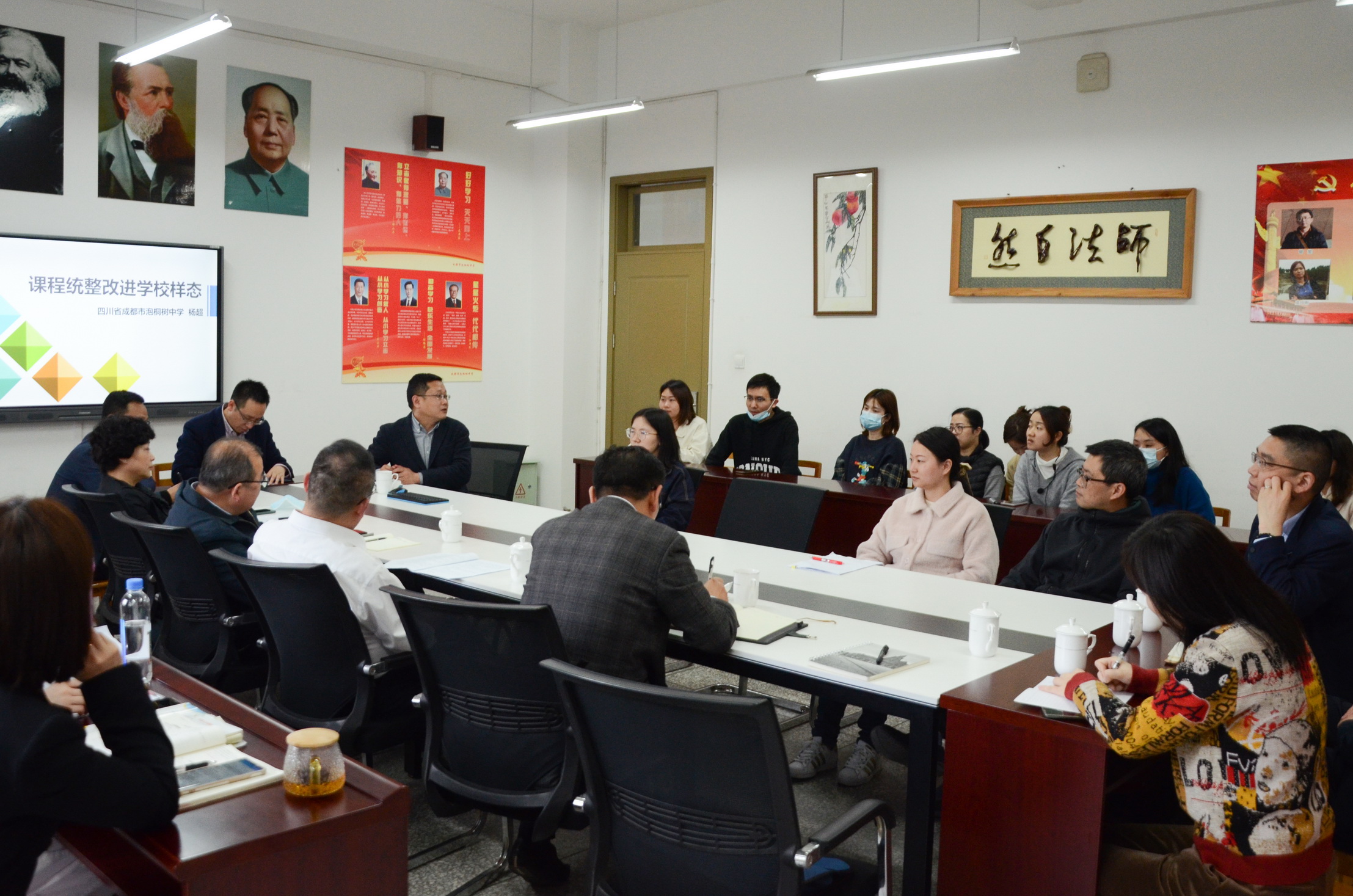 随后,为进一步深入了解泡中的教学常态和课堂规范,教育部领导们在会议室和我校部分老师进行了访谈和交流。