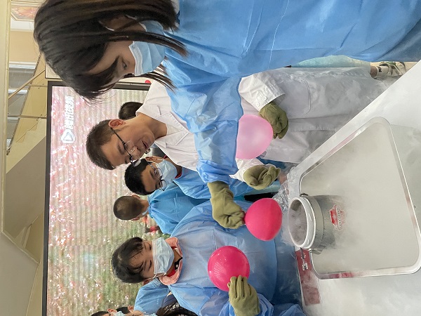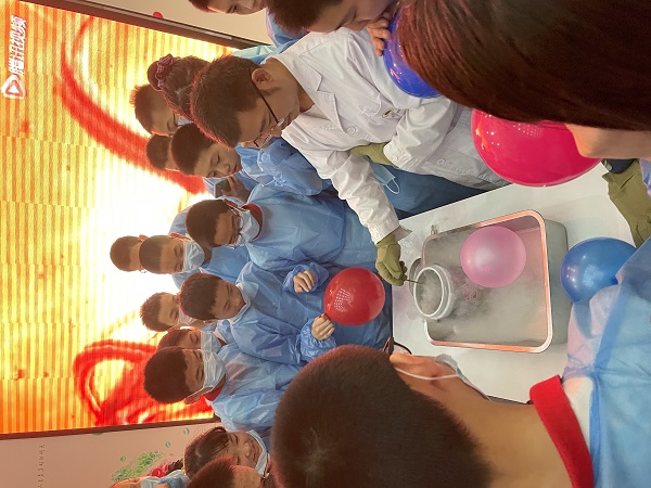 最受令人激动的环节当然是小实验,工作人员提来了一壶液氮,大家分到了一个气球。那么问题来了——将气球吹起来之后放到液氮里,会发生什么变化呢?大家议论纷纷,有人认为会爆掉,有人认为会消失,有人觉得根本不会有变化......让我们实际操作看看结果吧!工作人员吹起了一个气球,带上手套,将气球泡到液氮里,那个气球顿时就泄了气,慢慢地缩小,旁边液氮渗出冷气,在气球四周漂浮,好像要把它吞噬似的,最终那个气球变成了一根蔫黄瓜,皱巴巴的耷着头。可是一旦把这个气球拿出液氮,它又慢慢开始复原了,大家都直呼神奇!!!