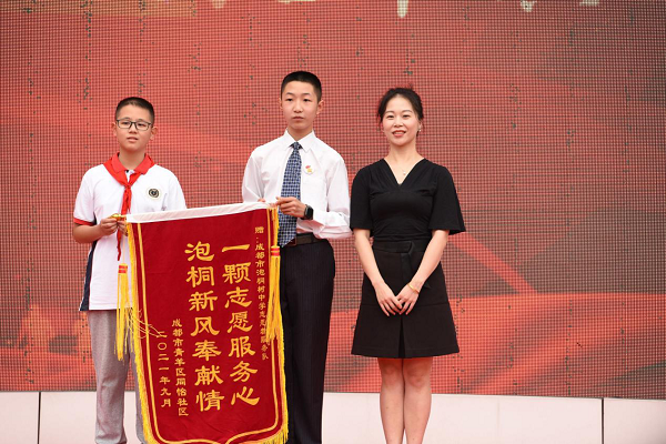 在学校,已经有部分学子主动承担起了社会责任,成都市泡桐树中学学生志愿者服务队,用自己的力量做贡献,受到了社会的好评,同怡社区刘书记代表社区为他们授予锦旗,给予高度肯定。