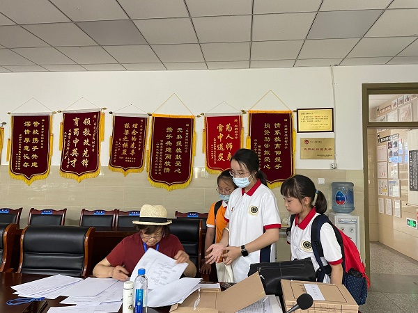 在李霞霏副校长、王其明主任陪同下对学校教学楼、学科教室、楼道进行了走访,翻阅了学生的作业,并与教师就“学业”、“课外读物”、“睡眠”等相关问题进行了交流,听取了一线教师对于政策的理解和执行情况。